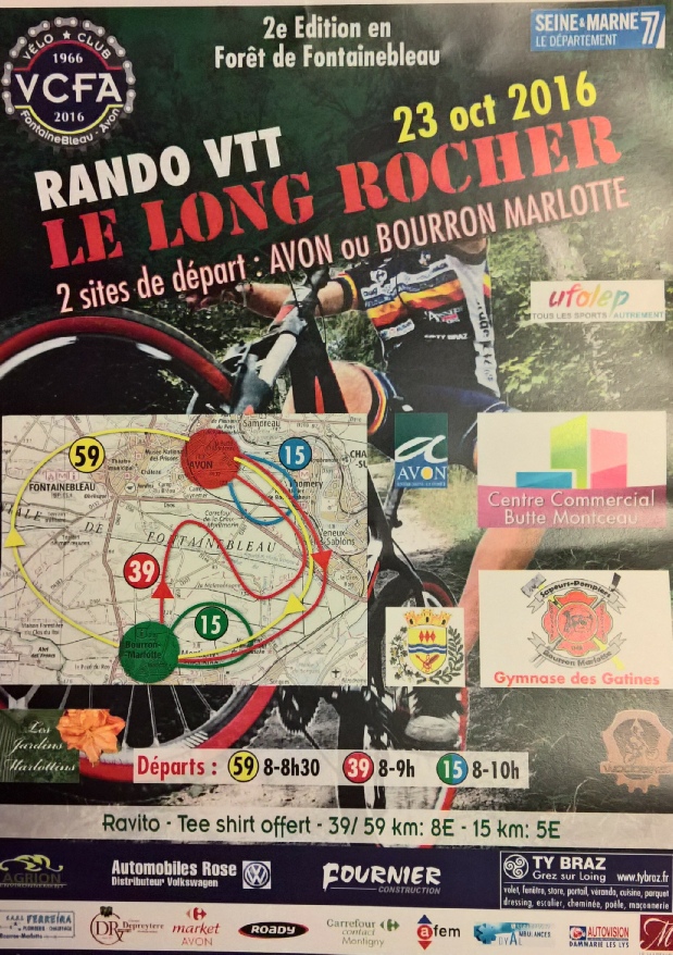 Vous avez participé à notre randonnée VTT en 2015 et vous en remercions. Le Vélo-Club FONTAINEBLEAU/AVON a reconduit cette randonnée appelée "le long rocher" mais avec une innovation car il y aura deux lieux de départ/arrivée un à AVON comme l'an passé et l'autre à BOURRON MARLOTTE;